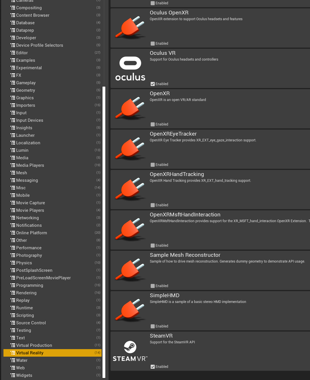 플러그인 셋팅에서 Oculus VR과 Steam VR이 Enabled 되어있는지 확인. (SteamVR이 꺼져있으면 템플릿 블루프린트가 오류남)